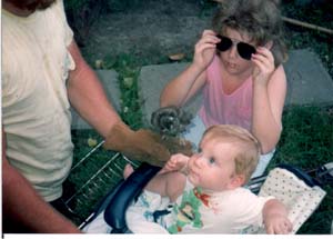 I was not realy sure what was going on here I was to small to understand that my Dad was holding a baby owl for me to see. Mom said my eyes got big like the owls eyes. The owl stayed close to us we could here it who who ing up in the tree at night. |