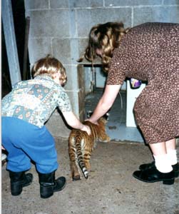 My sister Autumn and I were petting this baby Tiger. Lori has a big Tiger she named "HOPE" that she raised when it was only two days old she began bottle feeding him. He weighs in at like 500 lbs now. She handles him. We got to mess around with this cub and also her baby bear "OSO". Autumn got to bottle feed the bear. She has a lot of "EXOTIC" animals. Lori owned the pet store. Its gone now though. We met her through Mom & Dads friend Dr. Alice.